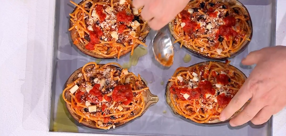 Per Giovanna Civitillo è ormai tempo di esami. La scuola di cucina di Daniele Persegani si avvia alla chiusura e lo fa con un’altra delle sue ricette imperdibili, quella delle melanzane ripiene di spaghetti.