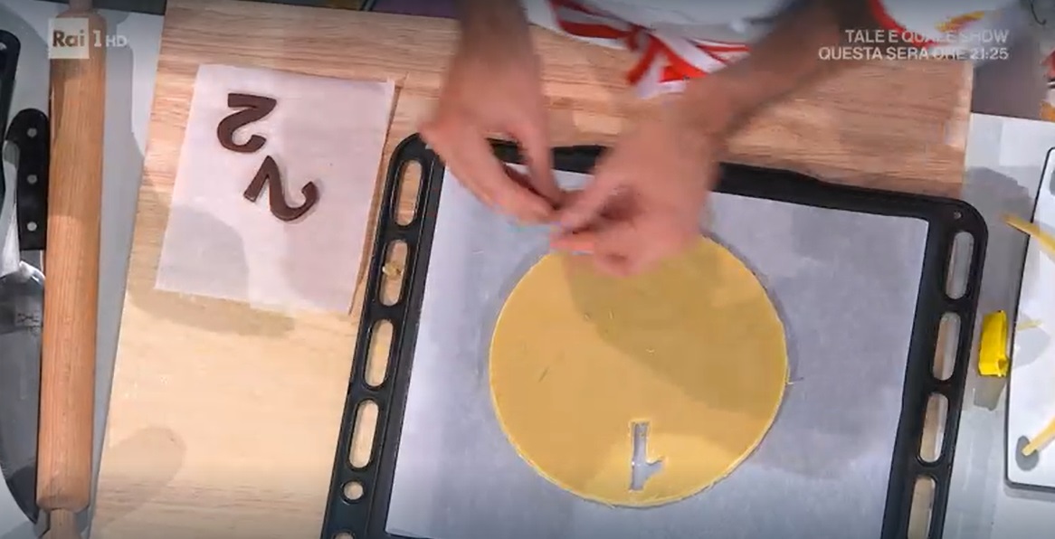 Stendiamo la frolla chiara rimasta, in modo da ottenere un disco del diametro della torta. Con degli stampini a forma di numero pratichiamo dei fori (a forma di numero), in modo da ottenere un orologio. Inseriamo nei fori ottenuti dei numeri ottenuti dalla frolla al cacao (la stendiamo e ritagliamo i numeri con gli stessi stampini usati in precedenza). Cuociamo l’orologio ottenuto in forno caldo e statico a 175° fino a leggera doratura.