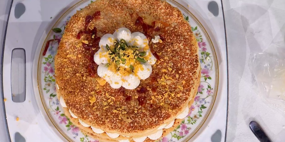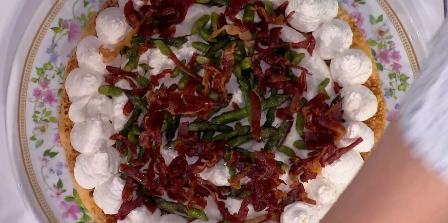 Prendiamo la prima sfoglia e la posizioniamo sul vassoio. Creiamo sopra un primo strato di crema, quindi distribuiamo sopra gli asparagi spadellati e freddi ed un po’ di prosciutto croccante. Ripetiamo gli strati con sfoglia, crema, asparagi e prosciutto. Finiamo con l’ultimo strato di sfoglia, spuntoni di crema e decoriamo a piacere con i tuorli sodi sbriciolati.