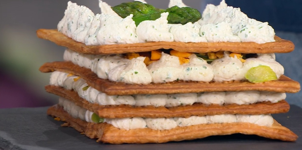 Prendiamo il primo rettangolo di sfoglia e creiamo sopra uno strato di crema di ricotta, distribuiamo sopra gli asparagi stufati, il tuorlo sodo sbriciolato e proseguiamo con sfoglia, crema, asparagi e tuorlo fino a creare 4 strati. Finiamo la crema e le punte degli asparagi.