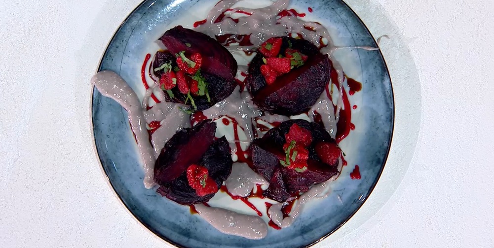 Sciacquiamo le barbabietole, le accatastiamo una sull’altra, le leghiamo strette con lo spago, in modo da ottenere come un medaglione, ed aspettiamo 10 minuti. Dopo il riposo, mettiamo il medaglione a cuocere su una padella con un dito d’olio ancora freddo: deve formarsi una crosticina scura. Eliminiamo lo spago e le serviamo con la salsa di lamponi e quella di formaggio di capra. Finiamo con i lamponi freschi (vedi sotto).