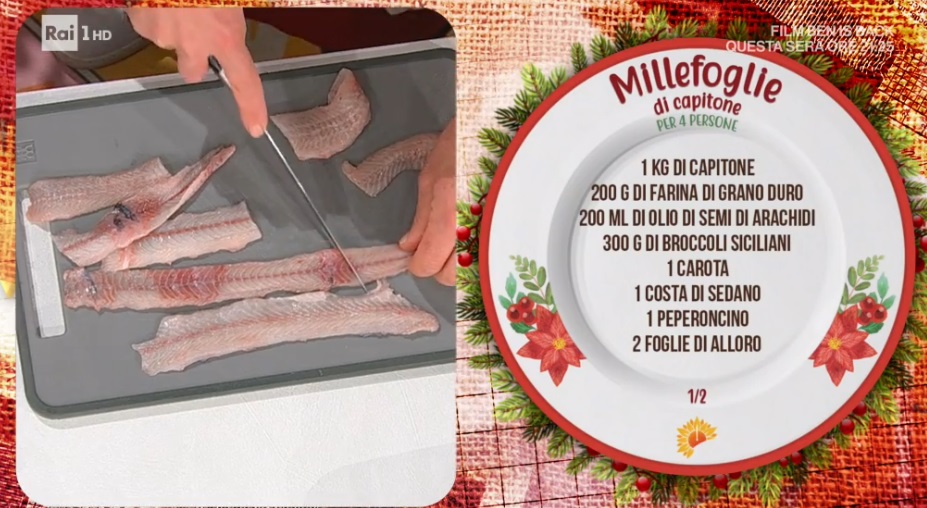 - 1 kg capitone, 200 g farina di grano duro, 200 ml olio di semi di arachidi, 300 g broccoli siciliani, 1 carota, 1 costa di sedano, 1 peperoncino, 2 foglie di alloro, 1 rametto di menta, 1 spicchio di aglio, 100 ml aceto di mele, pepe, olio evo, sale