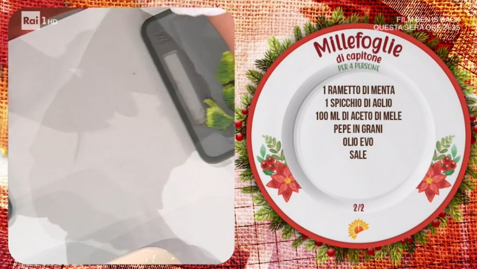 Puliamo e tagliamo a dadini carote e sedano, li stufiamo in una padella con un goccio di olio, della menta e una foglia di alloro, poi uniamo un goccio di aceto di mele, quindi uniamo i pezzi di capitone fritti e lasciamo che prenda i vari aromi. Formiamo un millefoglie alternando nel piatto pezzi di capitone con le verdure e concludiamo con i broccoli. Nappiamo col sughetto di cottura rimasto.