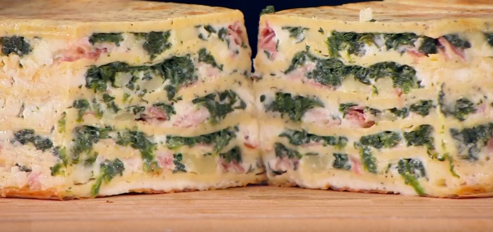Capovolgiamo la millefoglie sul piatto da portata e la serviamo a fette. Possiamo accompagnare ad una fonduta di casera (panna e casera), oppure alla besciamella avanzata, arricchita con casera e formaggio grattugiato.