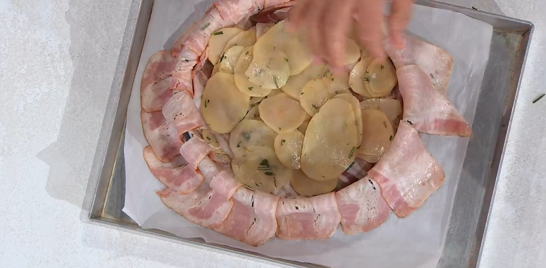 Foderiamo con carta forno una tortiera, mettiamo alla base e sui bordi (devono fuoriuscire) fette di pancetta stufata e sopra alterniamo strati di patate, una spolverata di formaggio grattugiato, fette di pancetta stagionata e fettine di provola affumicata.
