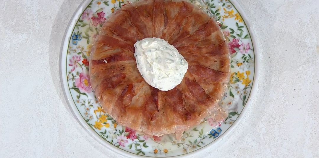 Inforniamo a 170⁰ per 50 minuti. Completiamo con panna acida mescolata ad erba cipollina tritata e un pizzico di pepe.