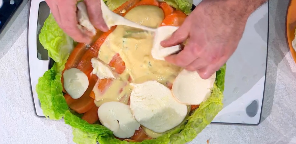 Foderiamo una pirofila o una tortiera con della carta forno, che ungiamo con olio. Copriamo la carta forno con le foglie di verza, quindi alterniamo all’interno strati di carote a strati di crema di yogurt, fette di provola affumicata, patate a fette e parmigiano grattugiato. Una volta esauriti gli ingredienti e riempita la teglia, ripieghiamo la verza sul ripieno e cuociamo in forno caldo e statico a 170° per 40 minuti: per i primi 20 minuti, la copriamo con un foglio di carta forno o alluminio.
