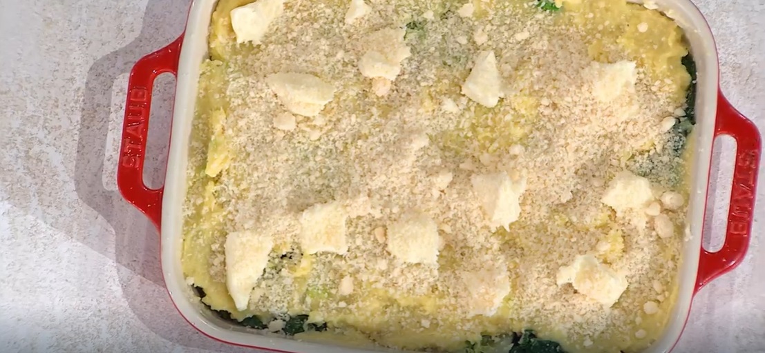 Imburriamo una pirofila e la foderiamo con le foglie di verza. Spalmiamo sopra 1/3 del composto di patate, spolveriamo con il parmigiano grattugiato e disponiamo sopra delle foglie di verza. Copriamo con 1/3 di impasto di patate, ancora foglie di verza e finiamo con l’impasto di patate rimasto, fiocchi di burro, formaggio grattugiato e pangrattato. Mettiamo in forno caldo e statico a 180° per 15-20 minuti. Serviamo con una grattugiata di scorza d’arancia.