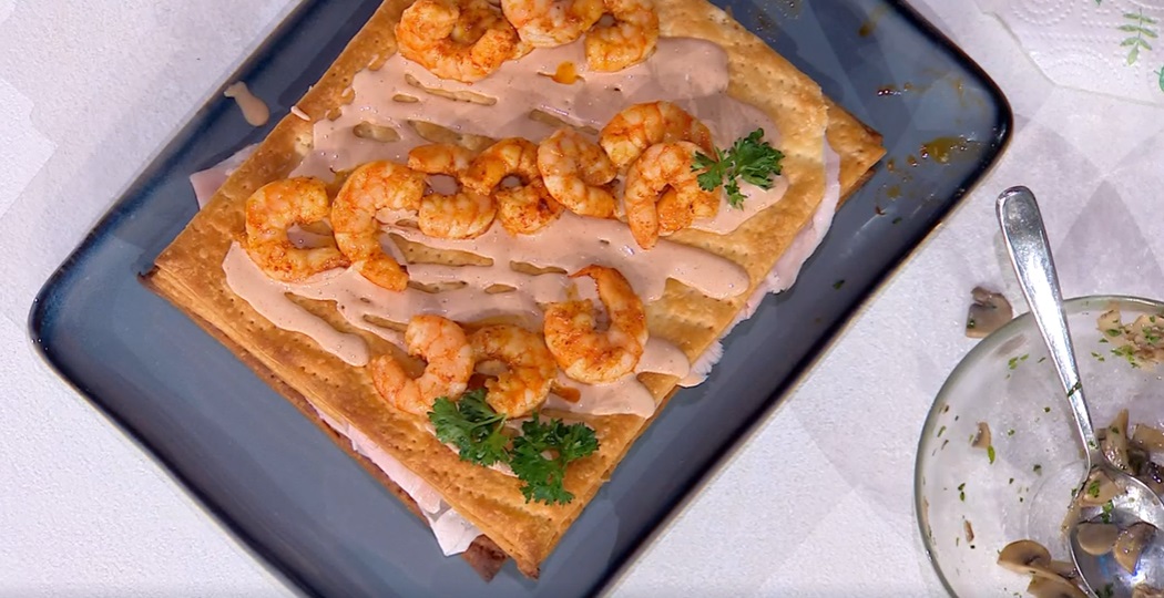 Componiamo: sul primo rettangolo di sfoglia, distribuiamo parte dei funghi trifolati e copriamo con del prosciutto cotto affettato. Distribuiamo sopra ancora dei funghi ed adagiamo il secondo rettangolo di sfoglia. Disponiamo sopra i gamberi e un po’ della salsa di maionese e ketchup. Copriamo con un’altra sfoglia e ancora funghi, cotto e funghi. Ancora sfoglia e finiamo con i gamberi, la salsa e del prezzemolo riccio per decorare.