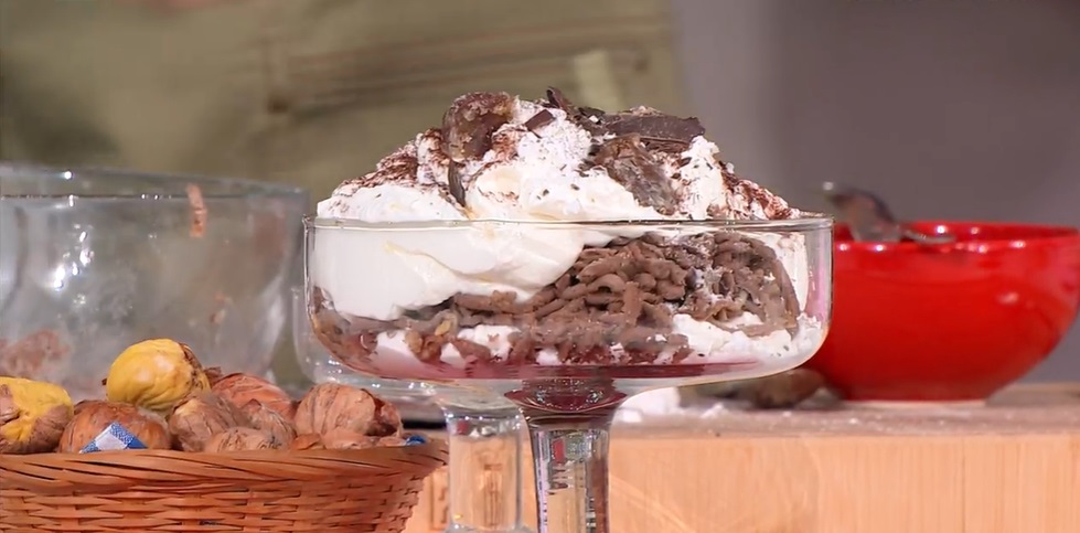 Mettiamo alla base di un contenitore un po’ di vermicelli di castagne, sopra la panna montata, delle scaglie di cioccolato, le meringhe sbriciolate, marron glacè e altri vermicelli di castagne. Infine panna montata e ultimiamo con dei marron glacè e una spolverata di cacao in polvere.