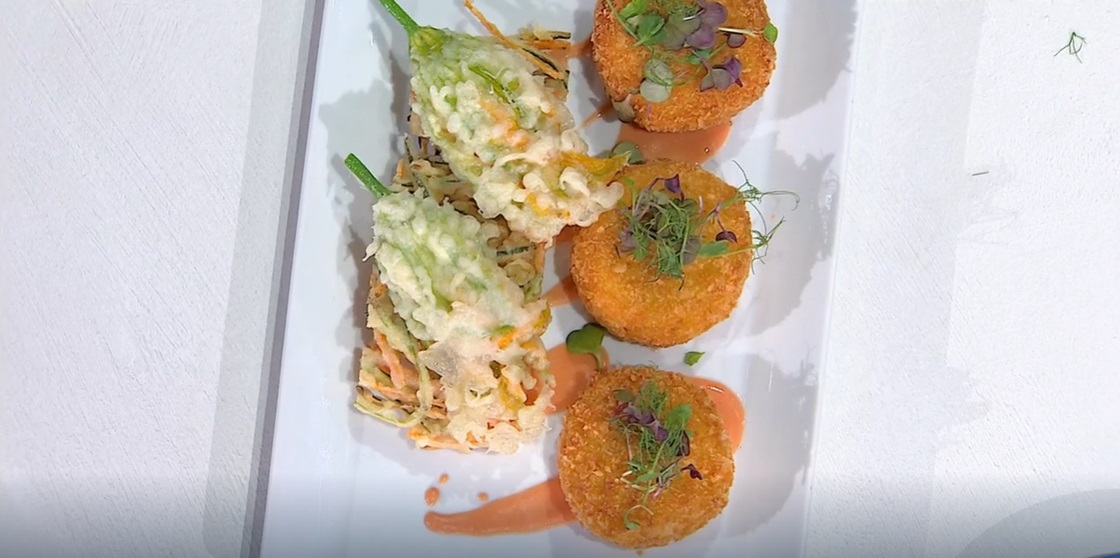 - 4 fiori di zucca, 4 filetti di alici sott’olio, 100 g mozzarella, 2 zucchine, 2 carote, 200 g farina, 1 uovo, 400 ml acqua frizzante, 10 g amido di mais