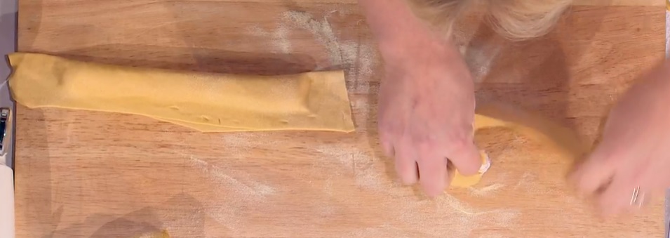 Tiriamo la sfoglia e su una striscia di circa 30 cm, formiamo un serpentello di ripieno. Ripieghiamo la sfoglia sul ripieno, ritagliamo l’eccesso ed arrotoliamo la ‘pappardella’ ottenuta su se stessa, a chiocciola (foto).