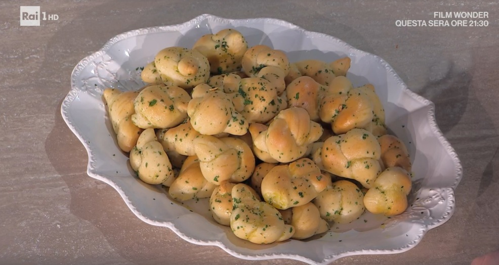 Ricaviamo dei pezzi di impasto di circa 20 g, che allunghiamo leggermente e lasciamo riposare per qualche minuto sul piano. Allunghiamo ogni filoncino, fino ad avere una lunghezza di circa 15 cm. Le rotoliamo nella farina e li annodiamo su loro stessi. Li disponiamo su una teglia con carta forno, li copriamo e li lasciamo riposare per 30 minuti al caldo.