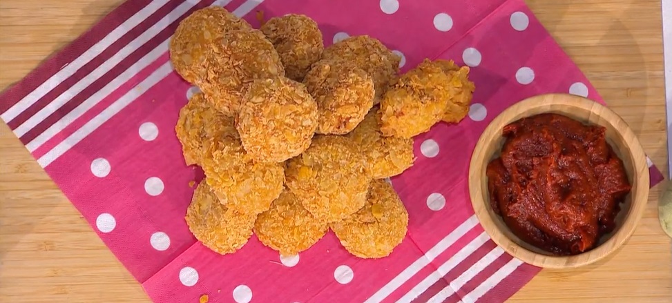 Con il composto, creiamo delle polpettine leggermente schiacciate e le passiamo nella pastella (o nell’albume sbattuto) e successivamente nei corn flakes sbriciolati insieme a delle patatine. Friggiamo in olio caldo (non troppo; circa 160°) e profondo fino a doratura.