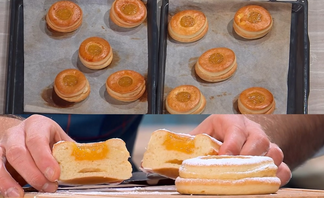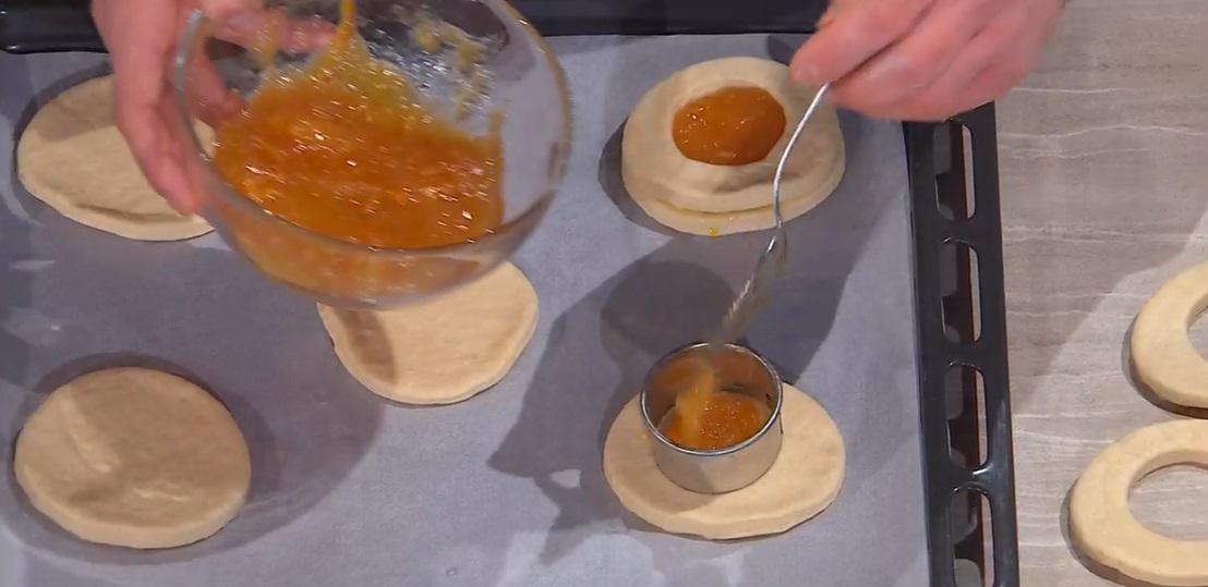 Sui dischi integri, mettiamo un cucchiaio di confettura al centro e spennelliamo leggermente i bordi con la stessa. Sovrapponiamo gli anelli di pasta, in modo da ricavare gli occhi di bue. Copriamo e lasciamo lievitare per 1 ora.