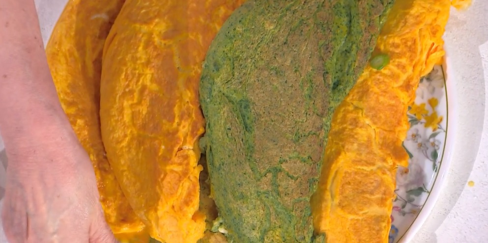 Per la variante verde, facciamo appassire gli spinacini in padella, con olio e sale, quindi li frulliamo insieme alle uova. Seguiamo il procedimento di cui sopra, farcendo con il formaggio roquefort e le carotine lesse a pezzetti.