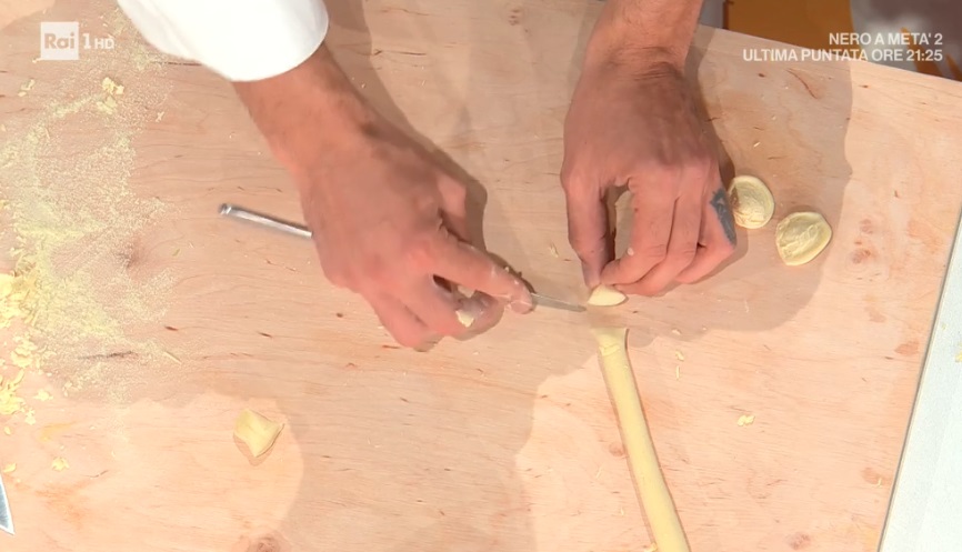 Ellis prepara le orecchiette fresche, ma noi possiamo già comprarle pronte. Per prepararle in casa, lavoriamo la farina di semola con l’acqua (metà peso della farina) ed un filo d’olio. Avvolgiamo nella pellicola e lasciamo riposare per almeno un’ora. Formiamo dei serpentelli, che tagliamo a tocchetti e trasciniamo, con un coltello, sul piano di legno. Cuociamo le orecchiette in acqua bollente e salata per il tempo necessario.