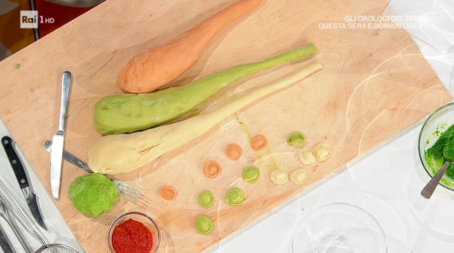Facciamo l’impasto delle orecchiette: per quelle bianche impastiamo acqua e farina di semola; per quelle rosse aggiungiamo il concentrato di pomdoro; per quelle verdi, invece, la crema di foglie di rape. Trasferiamo i panetti sulla spianatoia e di ognuno ne ricaviamo dei bigoli per ogni colore, ne ritagliamo dei pezzi di pasta di circa 2 cm e con un coltellino formiamo le orecchiette che poi giriamo sul pollice. Le lessiamo, separatamente, in acqua bollente e salata.