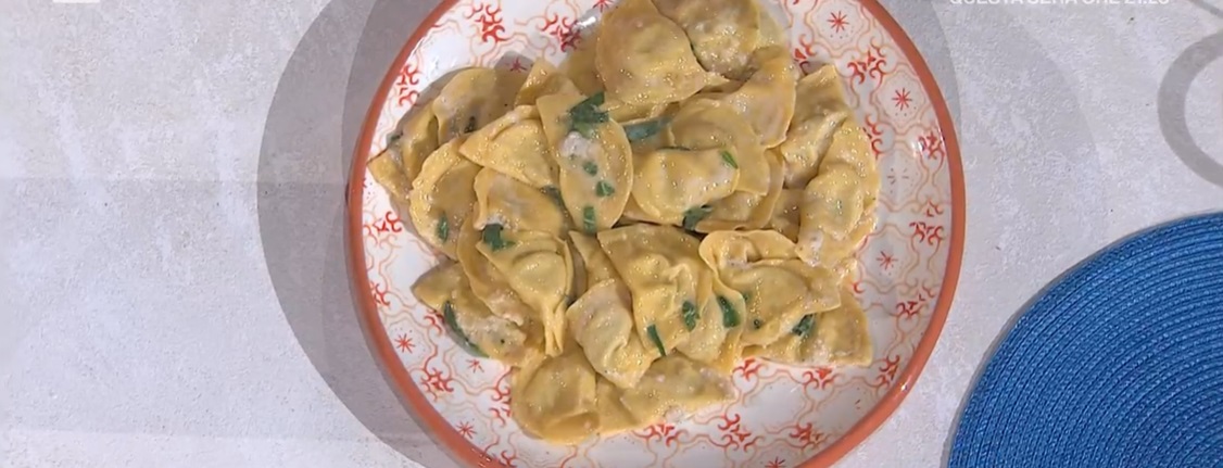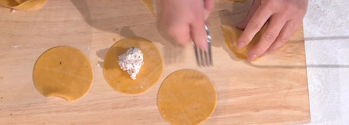 Tiriamo la pasta all’uovo in una sfoglia sottile. Ritagliamo dei dischi di circa 8 cm di diametro. Su ogni disco mettiamo una noce di ripieno, quindi ripieghiamo la pasta sul ripieno, a mezzaluna, sigillando bene i bordi con una forchetta. Li lessiamo in acqua bollente e salata per il tempo necessario.