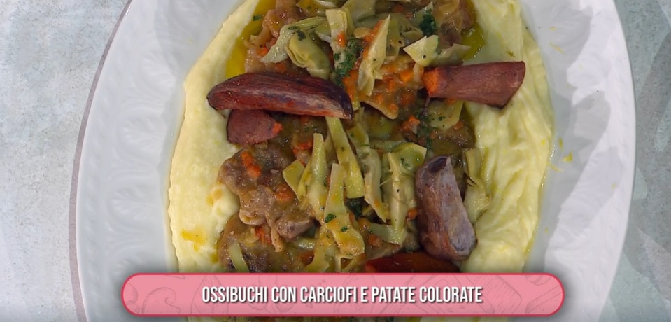 - 4 ossibuchi, 5 carciofi, 70 g cipolla, 70 g sedano, 50 g carota, 1 bicchiere di vino bianco, 1 l brodo vegetale, 1 spicchio d’aglio, 1 limone, prezzemolo, timo, mentuccia, olio, sale e pepe