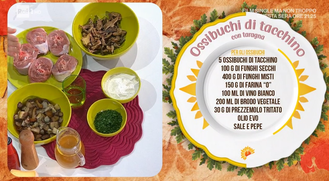 - 5 ossibuchi di tacchino, 100 g funghi secchi, 400 g funghi misti, 150 g farina 0, 100 ml vino bianco, 200 ml brodo vegetale, 30 g prezzemolo tritato, olio evo, sale e pepe