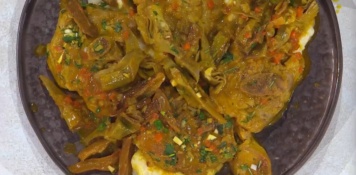 In un’altra padella ben calda, con un generoso filo d’olio, facciamo rosolare gli ossibuchi infarinati, su tutti i lati. Saliamo e pepiamo. Una volta rosolati, li uniamo al soffritto. Spolveriamo con la curcuma in polvere e sfumiamo con il vino bianco. Bagniamo con il brodo di pollo e l’acqua di ammollo dei funghi ben filtrata. Lasciamo bollire per 20 minuti. Uniamo i carciofi puliti ed affettati (o a spicchi), copriamo e completiamo la cottura (altri 20 minuti almeno).
