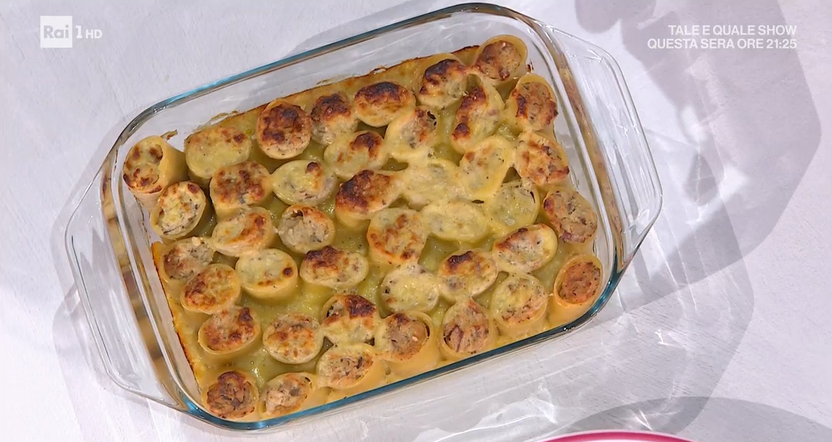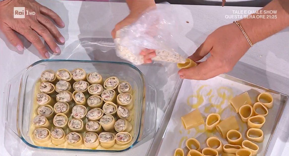 Cuociamo i paccheri in acqua bollente e salata per pochi minuti. Scoliamo e li disponiamo su una teglia, ben distanziati. Lasciamo raffreddare.