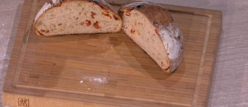 pagnotta ai pomodori di Fulvio MarinoDi pane, a tavola, non ce n’è mai abbastanza e lo sa bene Fulvio Marino, che anche oggi ci prepara uno dei suoi straordinari lievitati, un pane che racconta l’Italia e due sue eccellenze, il grano ed il pomodoro. Ecco la pagnotta ai pomodori.