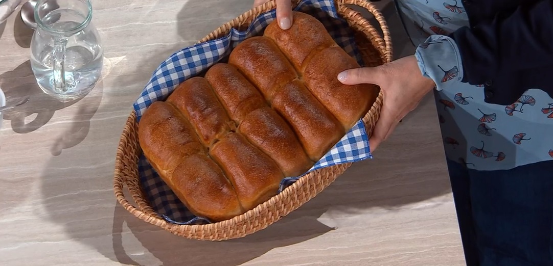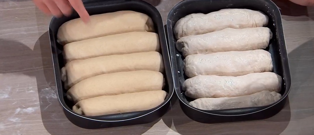 Ripieghiamo ogni filone su se stesso, dando la forma di filoncini lunghi circa 20-30 cm. Li posizioniamo all’interno di una pirofila o una teglia rettangolare della stessa lunghezza, vicini. Spennelliamo con un po’ di latte, copriamo e lasciamo lievitare fino al raddoppio. Spennelliamo ancora con del latte, con un coltello facciamo un taglio profondo al centro dei filoni, quindi cuociamo in forno caldo e statico a 230° per 25 minuti.