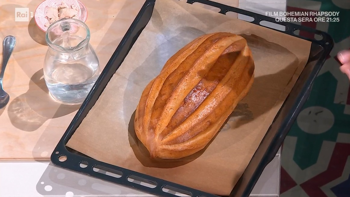 Capovolgiamo l’impasto sul piano infarinato, lo allarghiamo leggermente e lo ripieghiamo su se stesso, dando la forma di un filone dalle punte allungate. Lo posizioniamo su una teglia con carta forno, copriamo e lasciamo lievitare ancora 1 ora a temperatura ambiente.