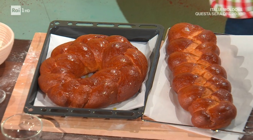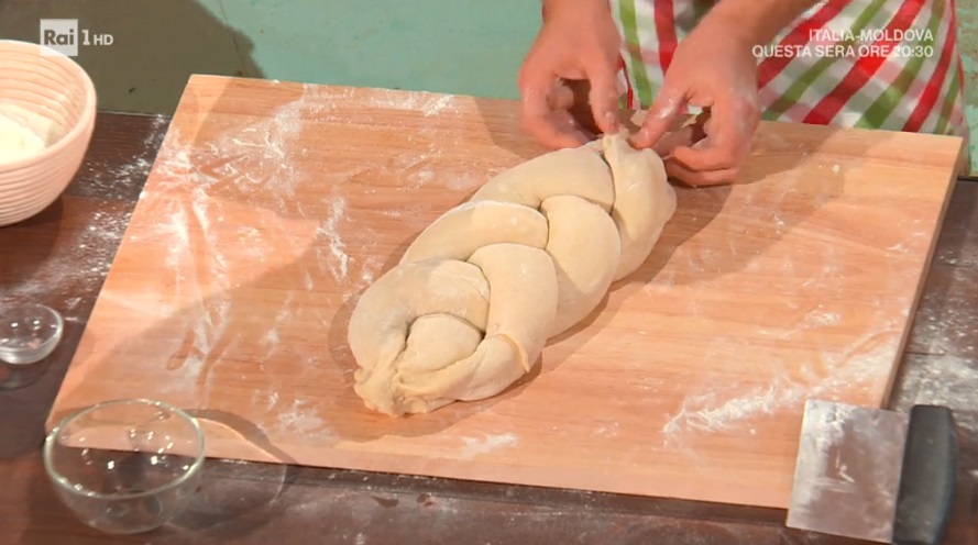 Allarghiamo l’impasto lievitato sul piano infarinato. Lo dividiamo in 3 parti uguali e formiamo 3 filoncini. Li affianchiamo e li intrecciamo. Trasferiamo sulla teglia, copriamo e lasciamo lievitare ancora 1 ora e mezza. Spennelliamo con l’uovo sbattuto. Cuociamo in forno preriscaldato e statico a 180° per 20 minuti: dev’essere ben dorato.