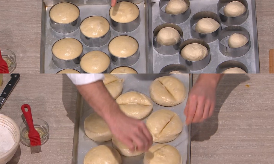Su una teglia con carta forno, disponiamo dei coppapasta oliati del diametro di 10 cm e, all’interno di ognuno, inseriamo un panetto. Copriamo e lasciamo lievitare fino al raddoppio.