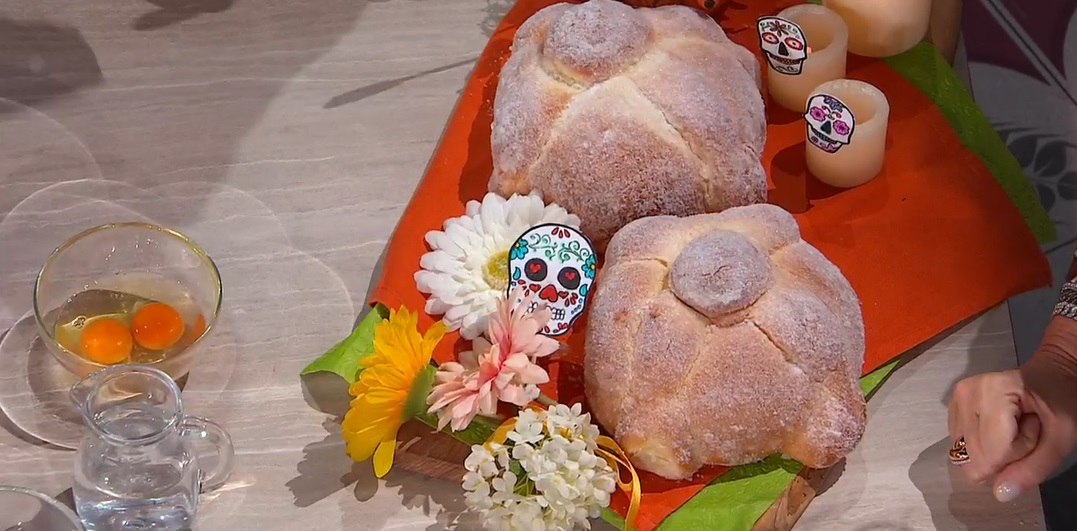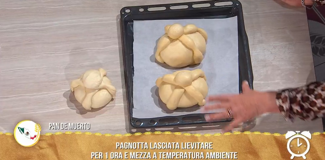 Preleviamo una palla di impasto, che lisciamo. Creiamo un salsicciotto, che sagomiamo come fosse un osso, lo dividiamo in due parti, che posizioniamo sopra la palla, incrociandole sulla sommità (foto). Nel punto di giuntura, posizioniamo una palline grande come una noce. Poniamo il pane su una teglia con carta forno, copriamo e lasciamo lievitare 1 ora e mezza a temperatura ambiente.