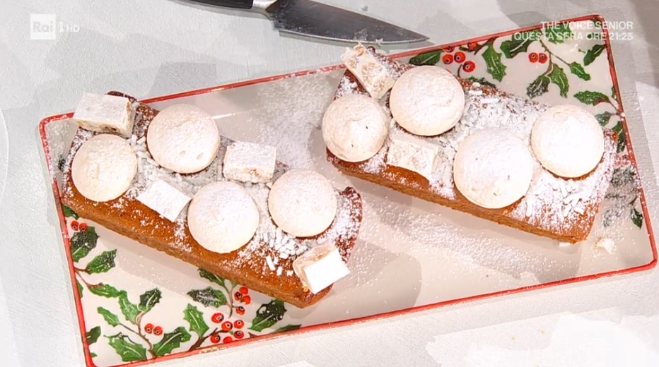 Versiamo l’impasto all’interno di uno stampo da plumcake foderato con carta forno, fino a 3/4 dell’altezza. Cuociamo in forno caldo e statico a 180° per 30 minuti. Una volta freddo, lo spennelliamo con della gelatina e decoriamo con meringhe, torrone e zucchero a velo.