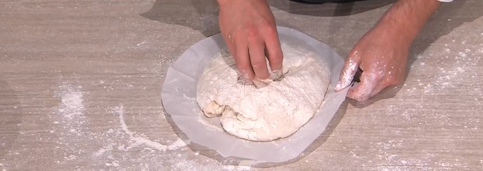 Capovolgiamo la pagnotta su un disco di carta forno, spolveriamo con la farina e con la mano afferriamo una noce di impasto al centro, quindi facciamo fare alla pagnotta un giro di 360°, formando come un ‘tuppo’ centrale.