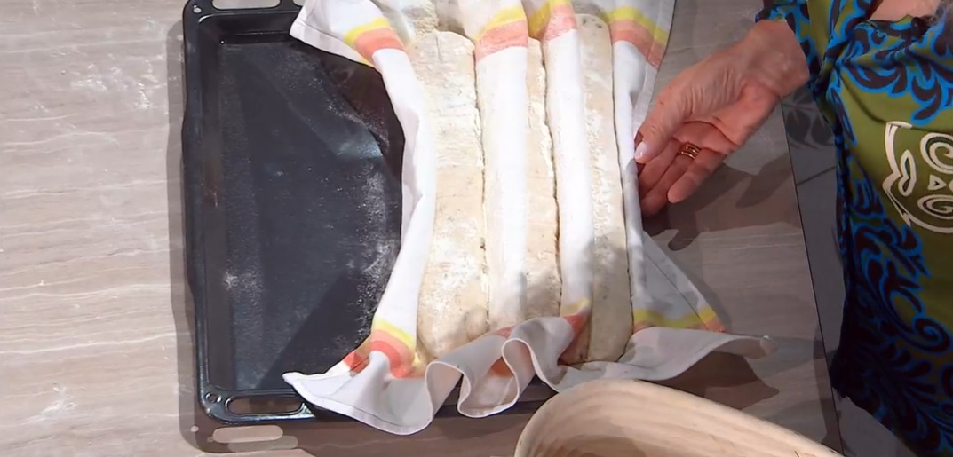 Con l’impasto, creiamo un rettangolo, appiattendolo leggermente con le mani. Tagliamo delle strisce, che tiriamo con le mani, in modo da allungarle leggermente e formare dei grissinoni. Li posizioniamo su un canovaccio infarinato, uno di fianco all’altro, stretti, intervallati da lembi di canovaccio. Copriamo e lasciamo lievitare ancora 3 ore a temperatura ambiente.