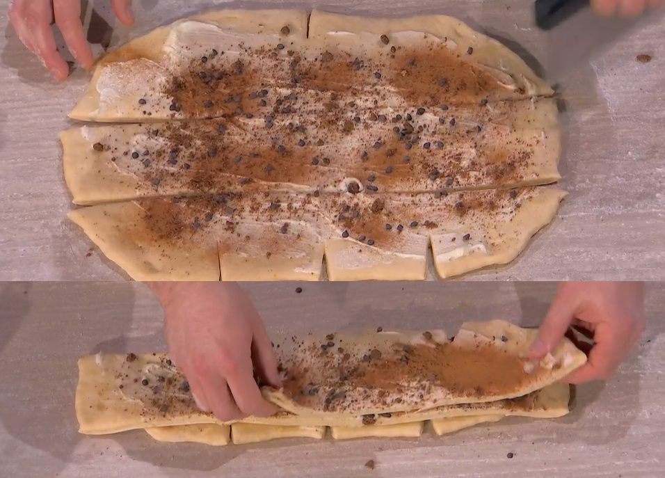 Stendiamo l’impasto ancora freddo sul piano infarinato, fino ad ottenere un rettangolo dello spessore di un cm. Spennelliamo la superficie con del burro a pomata e spolveriamo con zucchero di canna, cannella e gocce di cioccolato. Dividiamo il rettangolo in 3 strisce dello stesso diametro. Su quelle esterne, pratichiamo delle incisioni, formando come delle frange (foto). Sovrapponiamo le tre strisce di impasto e le dividiamo in 4 quadratoni.