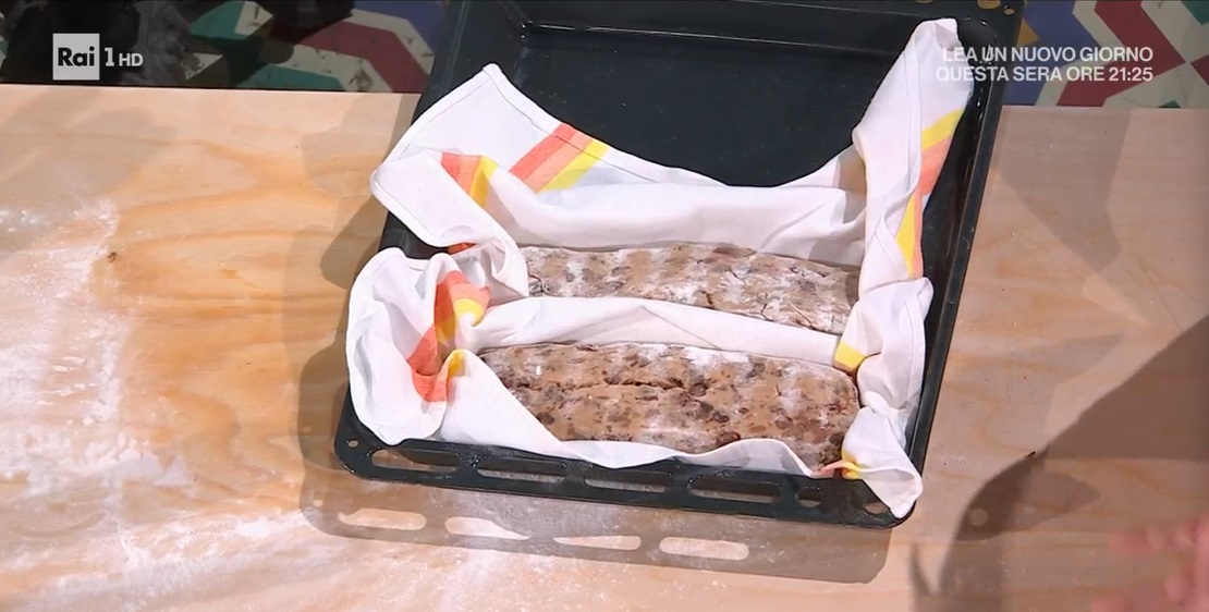 Dividiamo l’impasto in due parti e ad ognuna diamo la forma di due cilindri. Li mettiamo su un canovaccio infarinato, vicini ma divisi da un lembo del canovaccio. Copriamo e lasciamo riposare 8 ore in frigorifero.