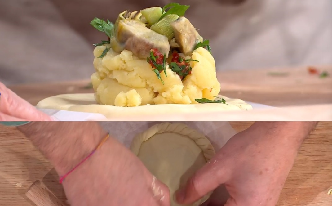 Sui dischi di pasta più grandi, mettiamo una cucchiaiata di patate lesse, spolveriamo con il trito di prezzemolo e aglio e distribuiamo sopra i carciofi stufati. Sovrapponiamo il secondo disco di pasta, quello più piccolo, quindi sigilliamo i bordi, facendo il caratteristico decoro con le dita.