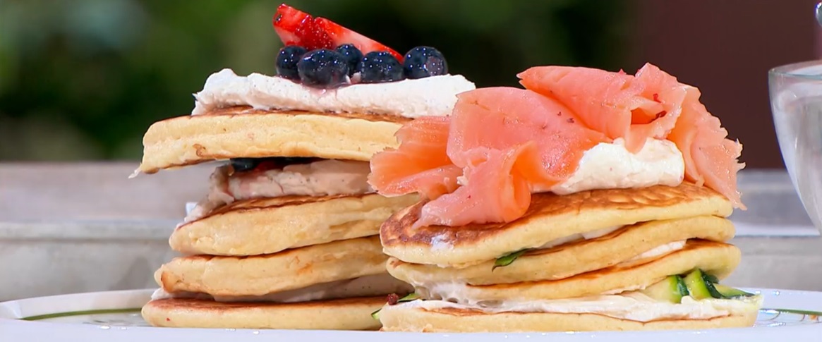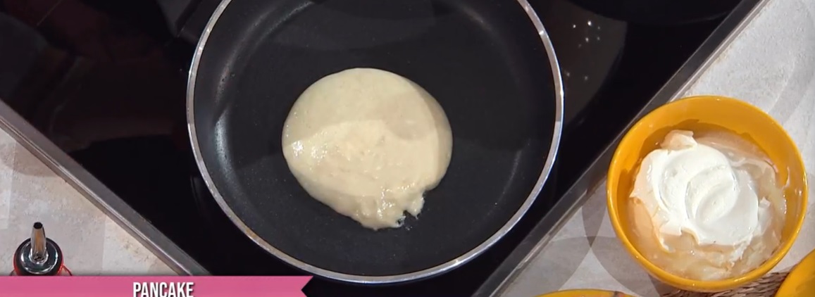 Scaldiamo una padella unta d’olio o burro. Coliamo sulla padella ben calda un mestolo di impasto ed aspettiamo che dori su un lato, per girarlo.