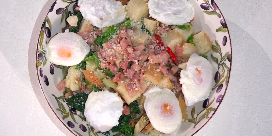 - 2 carciofi, 10 foglie di cavolo nero, 200 g cime di rapa, 1 cipolla bianca, 1 costa di sedano, 1 patata, 4 uova, 300 g pane di grano duro, 150 g pancetta, 1 spicchio d’aglio, 1 peperoncino fresco, olio, sale e pepe