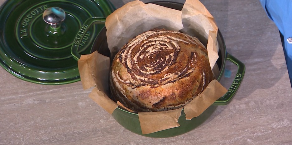 In forno, preriscaldiamo la pentola in ghisa a 240°. Inseriamo dentro la pentola rovente la carta forno e capovolgiamo sopra la pagnotta, praticando dei tagli in superficie. Mettiamo il coperchio e cuociamo in forno per 40 minuti; gli ultimi 10 minuti, togliamo il coperchio.