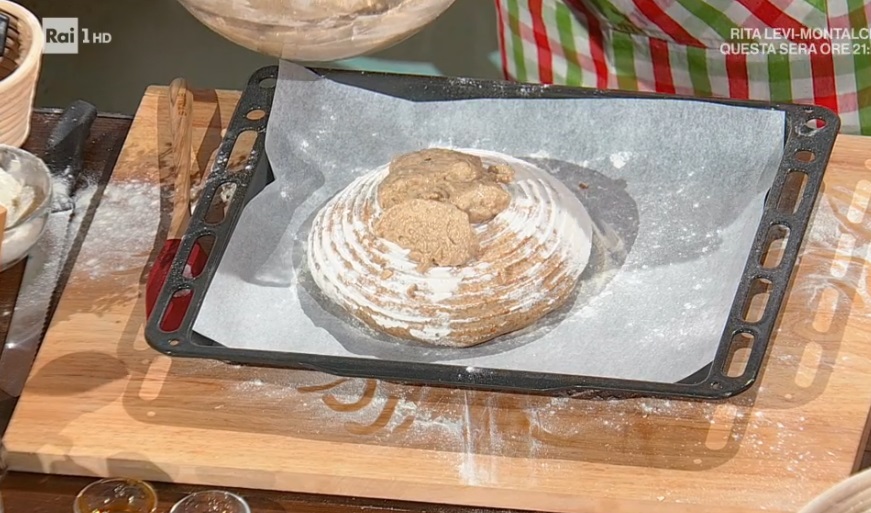 Nel frattempo, prepariamo le pagnotte o i filoncini da 600 g con l’impasto del pane lievitato. Pieghiamo i panetti e li inseriamo all’interno dei cestini da pane infarinati, rivolgendo le pieghe verso l’alto. Lasciamo lievitare, coperti, ancora 2 ore.