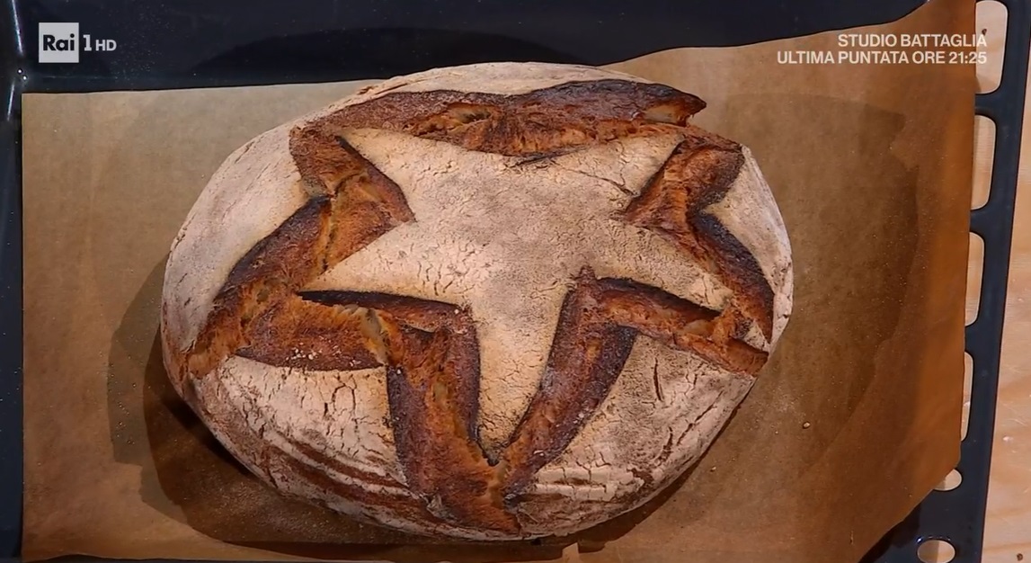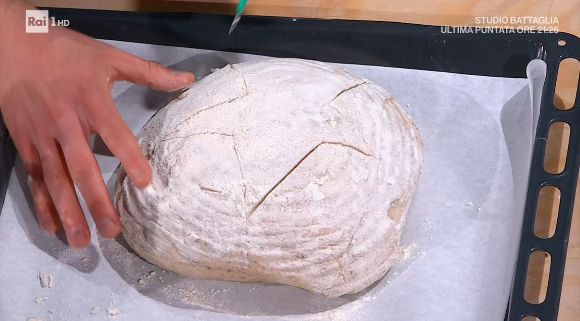 Capovolgiamo la pagnotta sulla teglia con carta forno ed intagliamo la superficie. Cuociamo in forno caldo e statico a 220° per 20 minuti, quindi abbassiamo a 200° per altri 20 minuti.