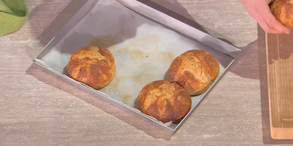 Dividiamo l’impasto in 4 parti uguali. Ripieghiamo i lembi esterni di ogni panetto verso il centro, formando delle pagnotte. Le disponiamo, distanziate, su una teglia con carta forno. Copriamo e lasciamo lievitare ancora 2 ore a temperatura ambiente.