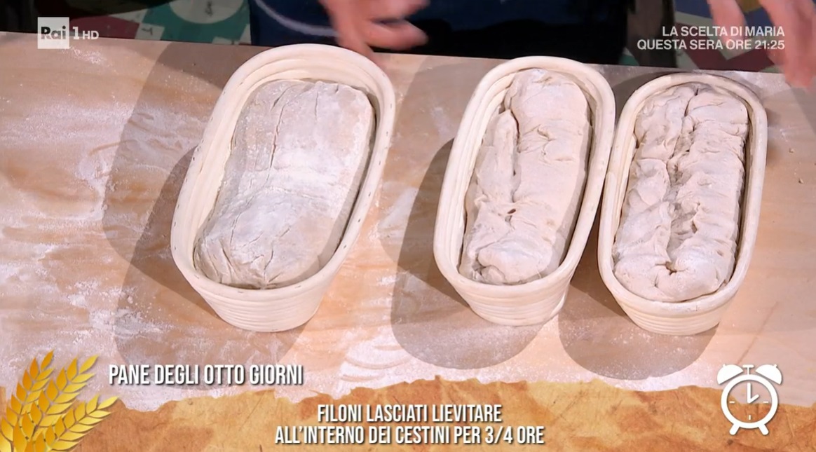 Dividiamo l’impasto in due parti e ripieghiamo ogni parte su se stessa, dando la forma di filoni. Inseriamo i filoni all’interno di cestini da pane infarinati, rivolgendo le pieghe verso l’alto. Copriamo e lasciamo lievitare ancora 3-4 ore a temperatura ambiente.