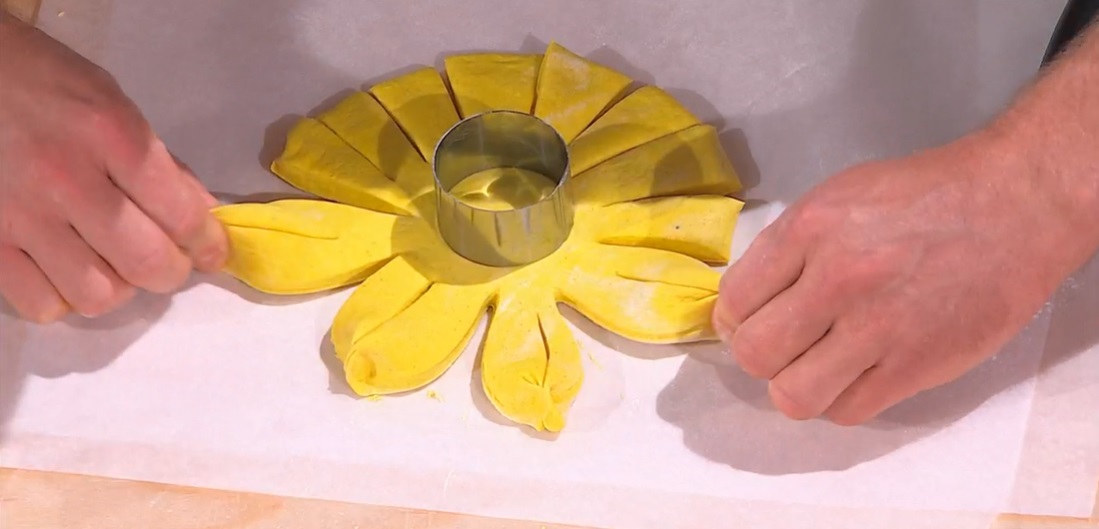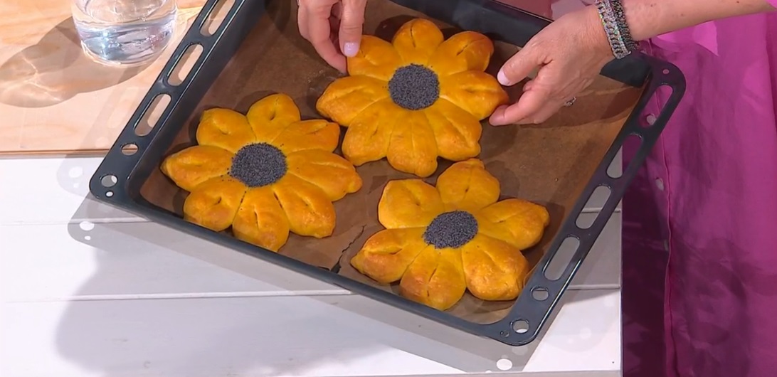Stendiamo con il mattarello, fino ad ottenere un disco spesso circa mezzo cm. Posizioniamo i dischi sulla carta forno, poggiamo un bicchiere o un coppapasta al centro del disco, quindi incidiamo i petali intorno (16 tagli in totale). Uniamo due tagli per volta, pizzicandoli alle punte: creeremo i petali (foto). Spennelliamo con poca acqua la parte centrale del fiore e spolveriamo con semi di papavero. Copriamo e lasciamo riposare ancora mezz’ora a temperatura ambiente. Cuociamo in forno caldo e statico a 220° per 20 minuti.
