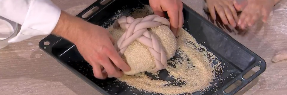 Con l’impasto rimasto, formiamo una pagnotta, ripiegando i lembi esterni verso il centro. Spennelliamo con il latte e ‘impaniamo’ nei semi di sesamo. Incrociamo le due trecce sopra la pagnotta. Inseriamo il pane all’interno di uno stampo per panettone dai bordi alti. Incastoniamo una noce col guscio al centro e dei chiudi di garofano intorno. Copriamo e lasciamo lievitare fino al raddoppio.