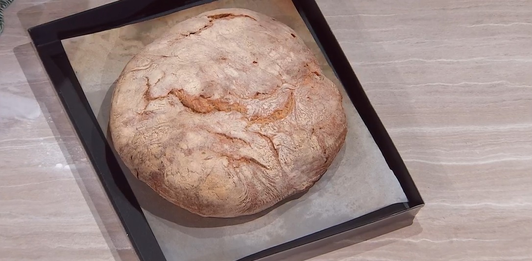 Ripieghiamo l’impasto su se stesso, formando una pagnotta liscia di circa 1,5 kg. Posizioniamo quest’ultima di una teglia infarinata, copriamo con un foglio di carta forno e lasciamo lievitare per 1 ora a temperatura ambiente.