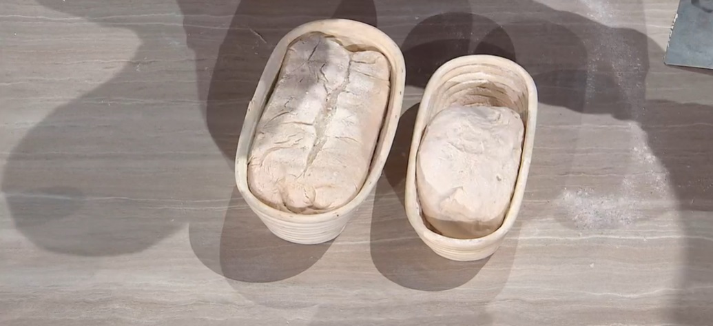 Di nuovo, ripieghiamo i lembi esterni di ciascuna pagnotta verso il centro, formando due pagnotte, che inseriamo in cestini da pane rettangolari ben infarinati, rivolgendo le pieghe verso l’alto. Copriamo e lasciamo lievitare 12 ore in frigorifero e 1 ora a temperatura ambiente.